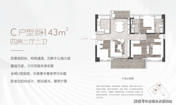143㎡的奢阔户型,特别打造了双景观阳台,明亮通透,山海美景一览无余,每一个空间都是大尺度,能一步到位满足每个人生阶段的不同家庭格局需求,无论三代同堂还是多胎家庭,实现一步到位。
