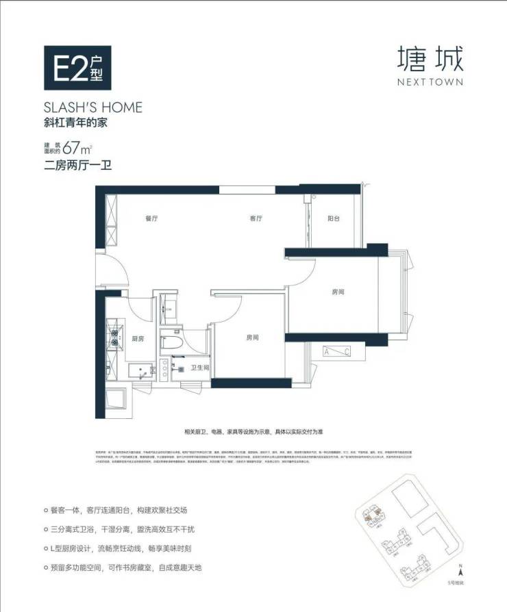 【E2户型67㎡二房两厅一卫】
