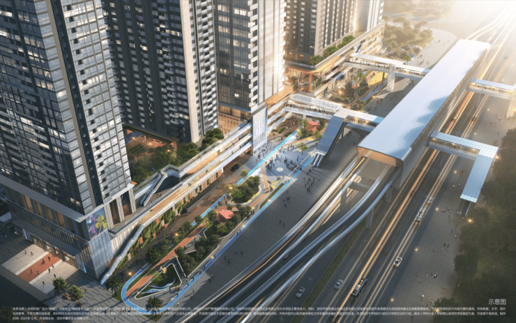 垂直交通场景:多首层设计,空中连板、无风雨连廊等,形成住宅、商业、办公与地面公交、空中地铁的接驳体系。