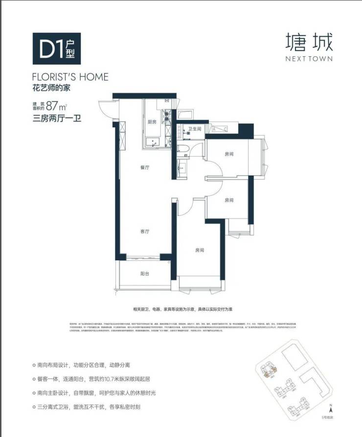 “10.7 m纵深紧凑南向三房”,10.7 m纵深餐客一体,通风采光极佳