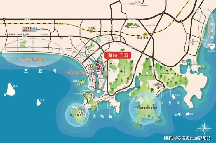 便捷交通:海映江湾项目位于河东路,北接迎宾路、南临鸿洲游艇码头,地处解放路与凤凰路之间。项目距三亚湾直线1.3公里,车程约6分钟可达三亚汽车站(约1.4公里),约13分钟至大东海旅游区(5公里),37分钟抵凤凰机场(14公里),40分钟达海棠湾(26公里)