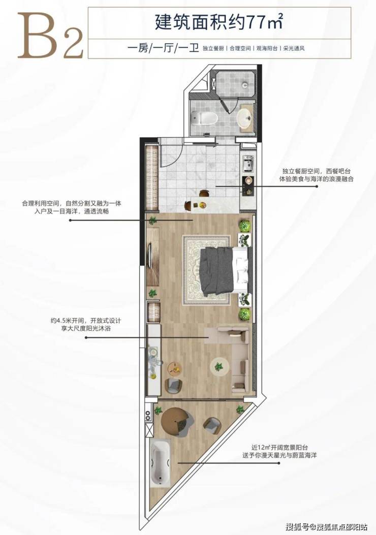 户型介绍B2户型约77平方米 一房一卫: