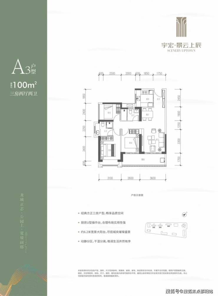 100㎡三房两卫,竖厅布局,三开间朝南,LDKB 一体化,客厅3.6米开间,连着一个约6.2米的阳台,U 型厨房、干湿分离卫生间。