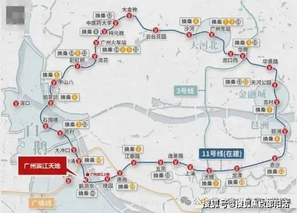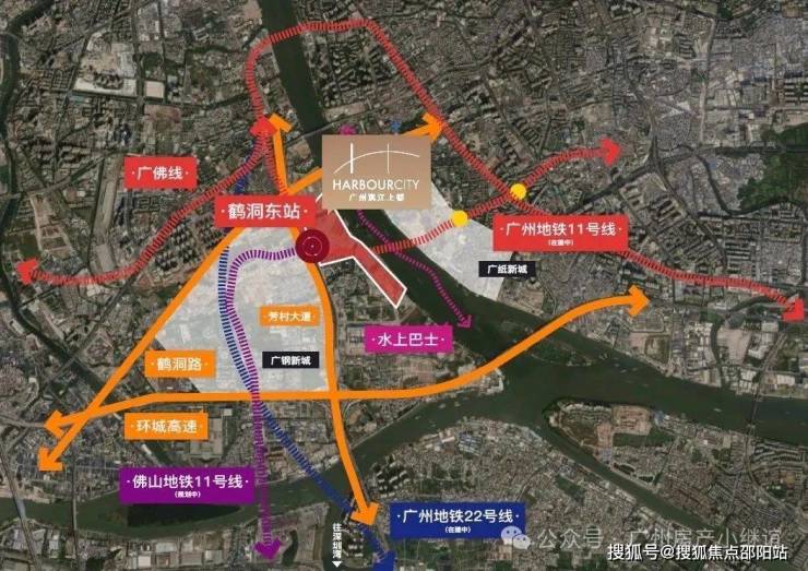 广州11号线以及佛山11号线鹤洞东站双地铁上盖,3横2纵大路网+公交站场+水上巴士,集水、陆、轨等多维交通方式于一体,半小时城央生活圈,1小时湾区生活圈。 11号线共设32个站点,全长44.2km,途径天河、白云、越秀、荔湾和海珠等5个含金量极高的区域,并连接广州火车站、广州东站等交通枢纽。