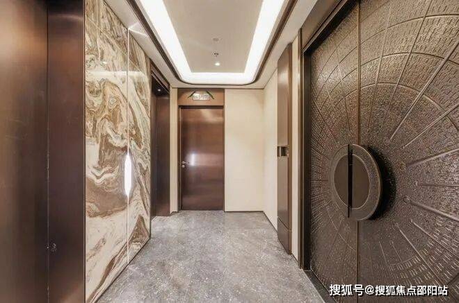 即便是标准层电梯厅这样的过渡空间,对奢石的打磨仍不妥协。背景墙采用一整块无缝的大河之舞奢石,流畅的曲线纹理如行云流水,既显沉稳气度,又暗含“万物共生、传承永续”的深意;