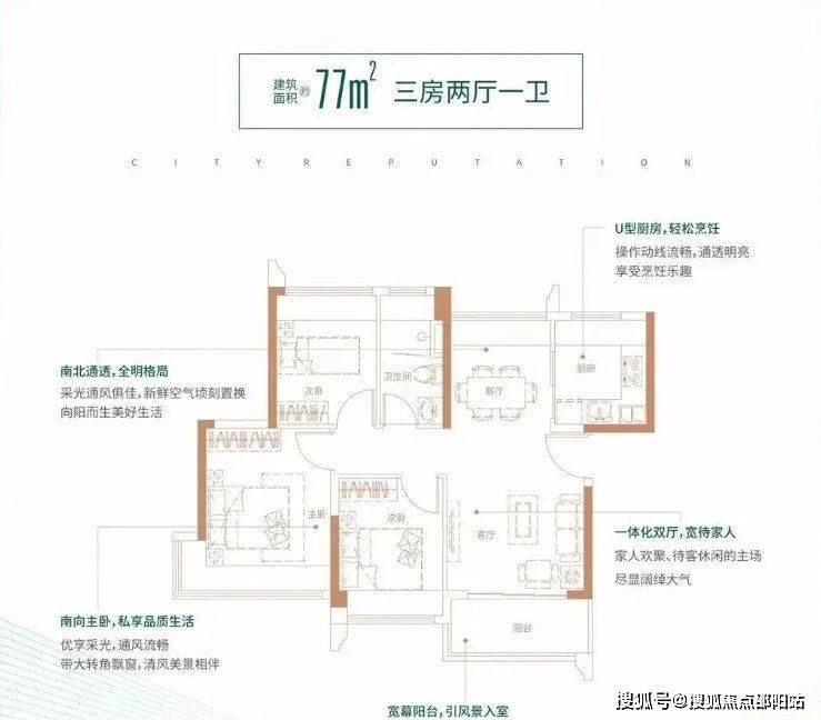 77㎡的3房2厅1卫,1/2栋04户型,设计的是竖厅南北通透格局,客厅3.4米开间,一体化双厅,三开间朝南,主卧270°转角飘窗,U型厨房,卫生间干湿分离,得房率:78.43%(不含赠送),阳台主朝南向。