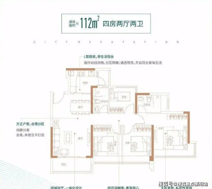112㎡的4房2厅2卫,设计的是经典竖厅格局,客厅3.9米开间,LDKB一体化,动静分区,四开间朝南,主卧270°转角飘窗,L型厨房还带1个生活阳台,卫生间干湿分离,得房率:78.43%(不含赠送),东南朝向。