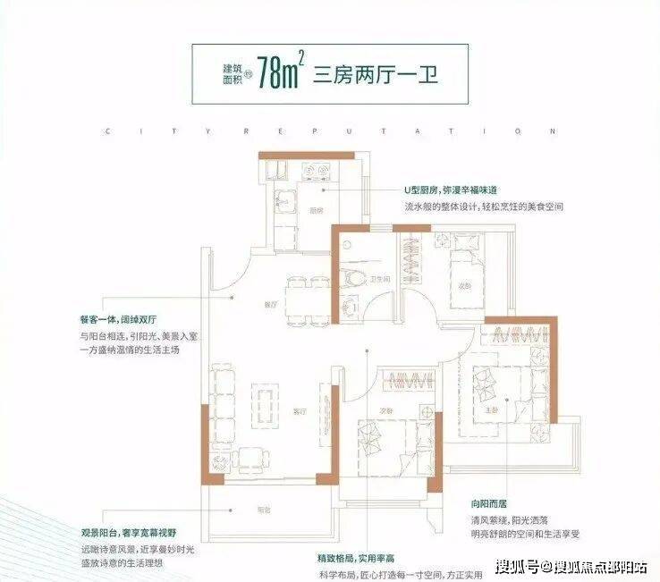 78㎡的3房2厅1卫,设计的是经典竖厅格局,客厅3.4米开间,LDKB一体化,动静分区,三开间朝南,主卧270°转角飘窗,L型厨房,卫生间干湿分离,得房率:74.71%(不含赠送),西南或东北朝向。