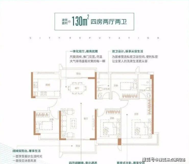 130㎡的4房2厅2卫,设计的是竖厅南北通透格局,客厅4.1米开间,一体化双厅双阳台,四开间朝南,主卧270°转角飘窗大套间设计,U型厨房,卫生间干湿分离,得房率:78.43%(不含赠送),阳台主朝东南向。