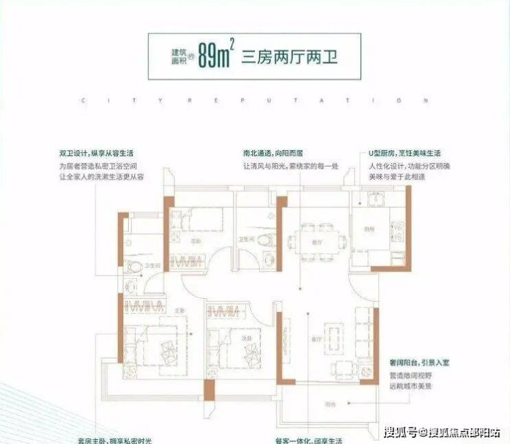 89㎡的3房2厅2卫,5栋02户型,设计的是经典竖厅格局,客厅3.6米开间,LDKB一体化,动静分区,三开间朝南,主卧270°转角飘窗,U型厨房,卫生间干湿分离,得房率:74.71%(不含赠送),西南或东南朝向。