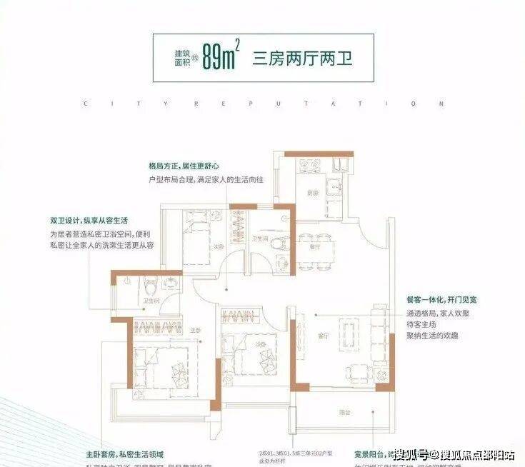 89㎡的3房2厅2卫,5栋01户型,设计的是竖厅南北通透格局,客厅3.6米开间,一体化双厅,三开间朝南,主卧270°转角飘窗,U型厨房,卫生间干湿分离,得房率:74.71%(不含赠送),阳台主朝西南向。