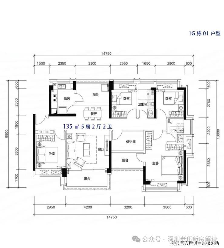 135m²5房2厅2卫,南北通户型,客厅开间4.2米,都有阳台改卧室以及餐厅改造,赠送后得房率在96%左右。