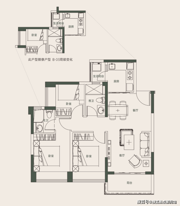 88㎡的3房2厅2卫,设计的经典竖厅格局,客餐厅一体化,三开间朝南,L型厨房,还带1个小生活阳台,得房率75.97%(不含赠送),都是东南朝向。该户型是见惯的传统三房户型,亮点在于有双阳台设计,东南向10F以上视野越过前面的综合楼的裙楼会比较开阔。位于1B座是两梯四户的格局,尺度感不亚于目前市面上95㎡的产品。