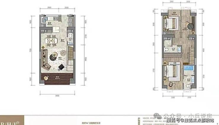 ★79㎡复式三房两厅三卫 南北通透,5.4米大开间,复式下层餐厨客厅连宽景阳台,另带一个法式小阳台。复式上层私密卧房全明采光,动静分区私享个性生活。另一个次卧带衣帽间。
