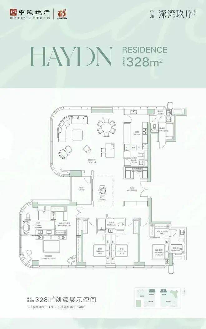 户型面积段设计为196-252-328㎡3-4房和400-600㎡顶层复式