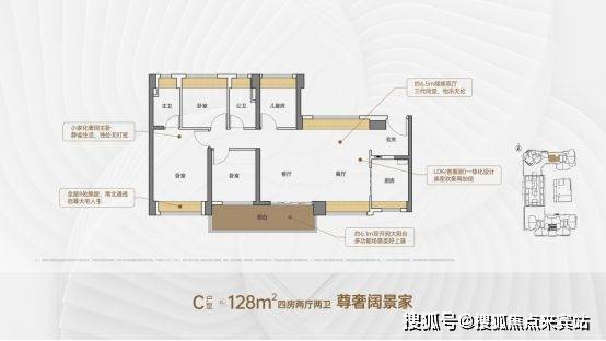 客厅约3.5米开间,LDK一体化设计,约5.9米双开间大阳台,主卧双面飘窗,全屋6面飘窗。