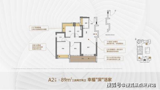 客厅3.5米开间,LDK一体化,客厅连接次卧出5.9米双开间大阳台,次卧270°转角飘窗。