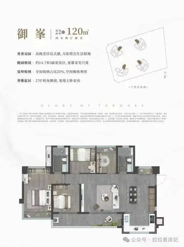 120㎡的4房2厅2卫,设计的是横厅南北通透格局,客餐厅开间8米,约14.7米超幕视野,超长阳台,主卧转角270°大飘窗,U型厨房,得房率:78.99%(不含赠送),阳台主朝西南或东南向。