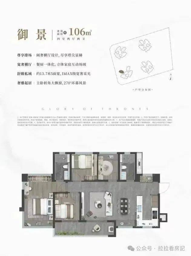 106㎡的4房2厅2卫,设计的是横厅南北通透格局,客餐厅开间5.6米,餐厨一体化,约13.7米超幕视野,超长阳台,主卧转角270°大飘窗,只有2栋07户型才有,得房率:78.99%(不含赠送),阳台主朝西南向。