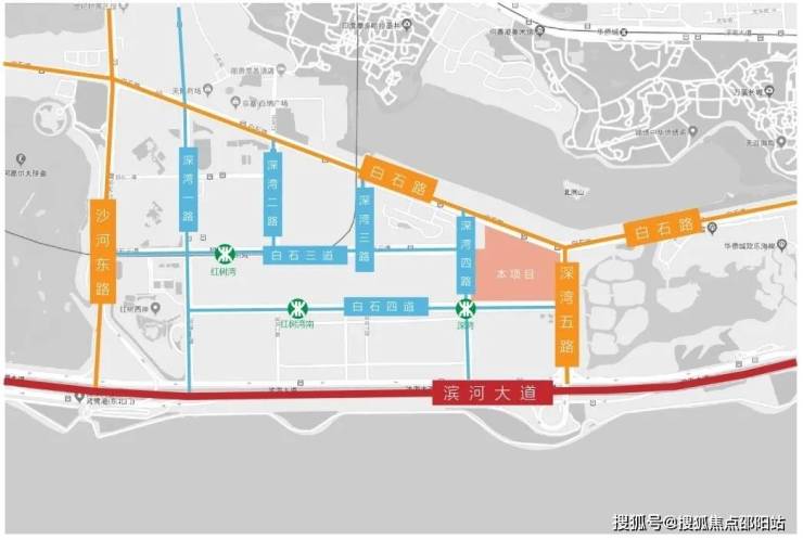 C、项目交通:本项目东临双向6车道深湾五路、南临双向4车道白石四道,西临双向4车道深湾四路,北临双向6车道白石路,南侧距离深圳的东西主干道—滨河大道约300米;片区有轨道交通9号线、11号线通过:在本地块西南角(深湾四路和白石四道交汇处)设有深湾站;距离地铁11号线红树湾南站约700米。