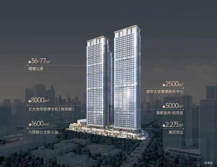 恒裕柏悦湾由2栋47层高公寓与2栋42层商办组成项目自带·约2.2万㎡潮流商业·约5000㎡精英会所·约8000㎡北大光华管理学院(北大光华瑞思楼)·约2500㎡清华大学港澳研究中心·约1600㎡六班制公立幼儿园共同组成约37万㎡垂直综合体——200米深湾超级地标