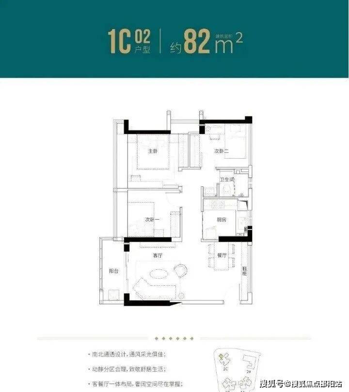 82㎡的3房2厅1卫(1栋C座01户型),设计的是竖厅南北通透格局,客厅3.6米开间,三开间朝南,动静分区,L型厨房,得房率:77.27%(不含赠送),阳台西南朝向。