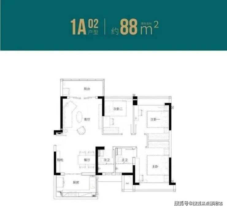 88㎡的3房2厅2卫(1栋A/B座01.02户型),设计的是竖厅南北通透格局,客厅3.8米开间,动静分区,主卧大套间设计,U型厨房,得房率:79.61%(不含赠送),阳台主朝西北向。