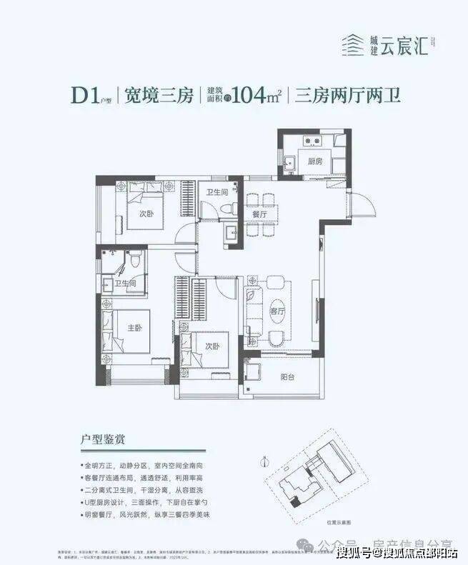 104㎡的3房2厅2卫,设计的竖厅南北通透格局,餐客厅一体化,U型厨房,阳台西南朝向。