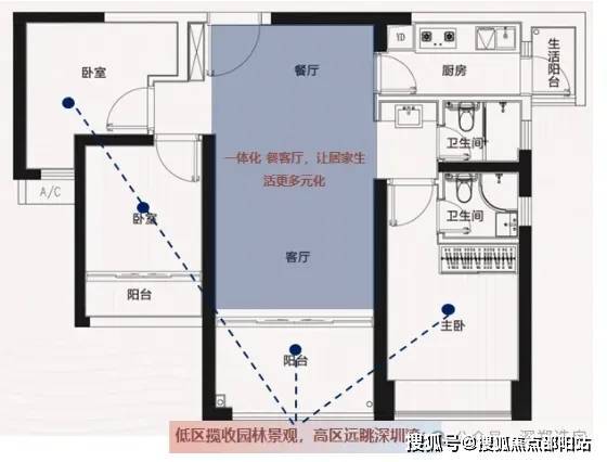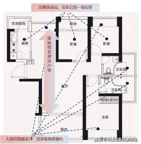 阳台阔绰:前海稀缺在售89㎡三房两卫三阳台,客厅阳台进深1.9米,揽收城园双景