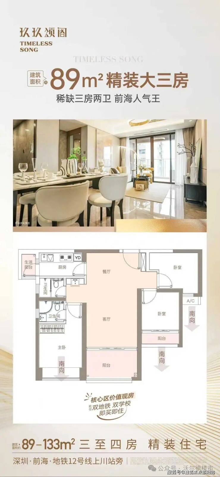 三阳台:前海黄金圈内,唯一在售89㎡三房两卫三阳台,客厅阳台进深2米,堪比140㎡大户型阳台