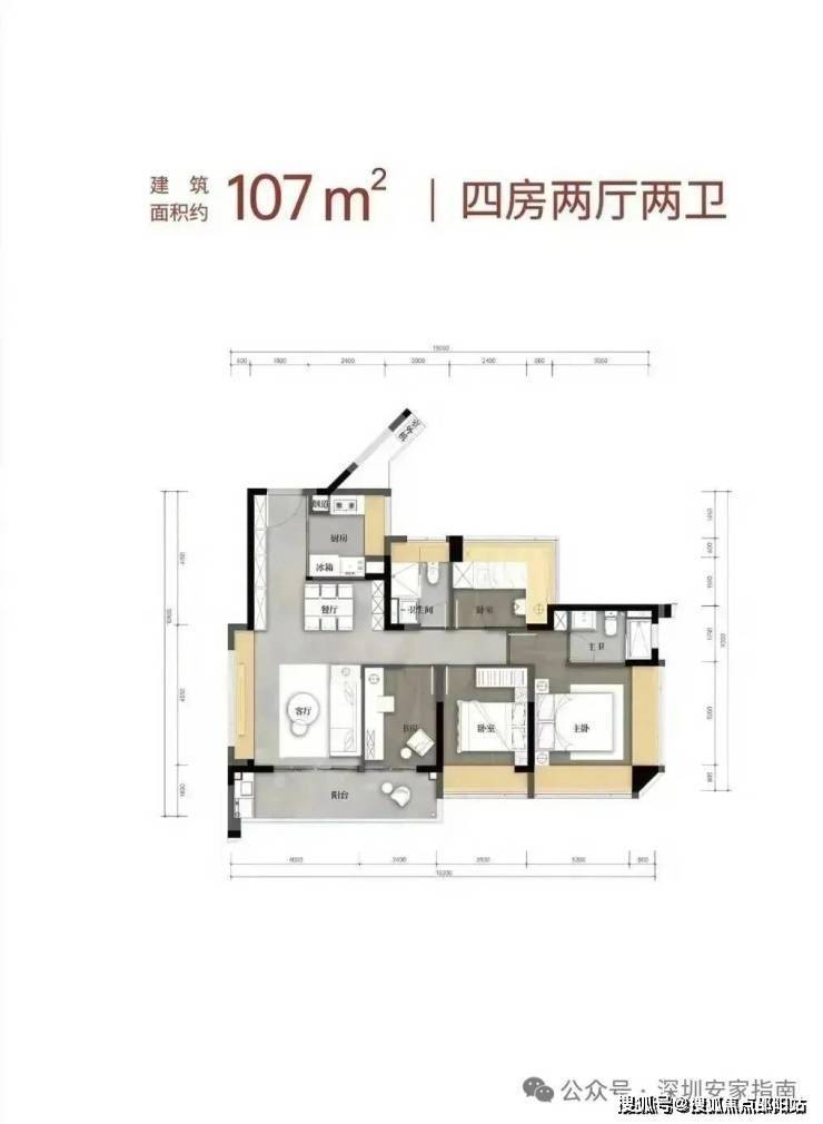 107㎡的4房2厅2卫,设计的是经典竖厅格局,客厅4米开间,LDKB一体化,S墙设计预留冰箱卡槽位,动静分区,分别做到了主卧17.18㎡/次卧11.2㎡/次卧8.64m²/次卧7.68㎡(包含墙体飘窗),U型厨房,卫生间干湿分离,得房率约79.6%(不含赠送),客厅连接次卧出10.24m²观景大阳台,东南朝向。套内面积85.19m²+赠送面积22.96m²=实用面积108.15m²,加上赠送面积后得房率101.08%。