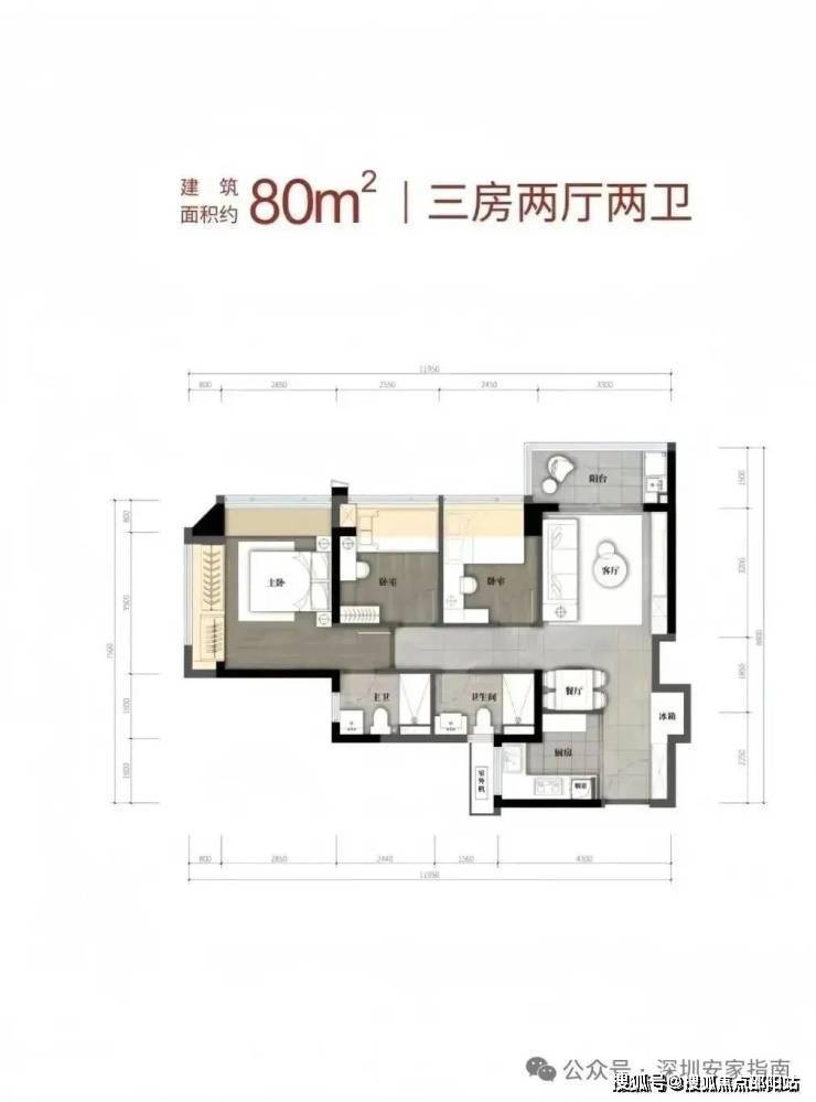 80㎡的3房2厅2卫(新增户型),设计的是竖厅格局,客厅3.4米开间,LDKB一体化,S墙设计预留冰箱卡槽位,动静分区,U型厨房,卫生间干湿分离,得房率约79.6%(不含赠送),阳台4东北朝向。