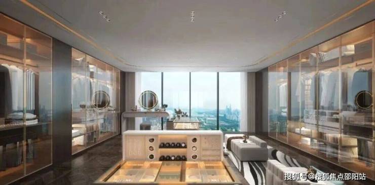 · 入门,是豁然开朗的复式格局。 挑高约6米的阔绰客厅,打造出宫殿般的空间感与仪式感。光影透过巨幅落地窗倾泻而下,在空间中自由流淌、舞蹈,完美诠释了“空中墅居”的非凡气度。