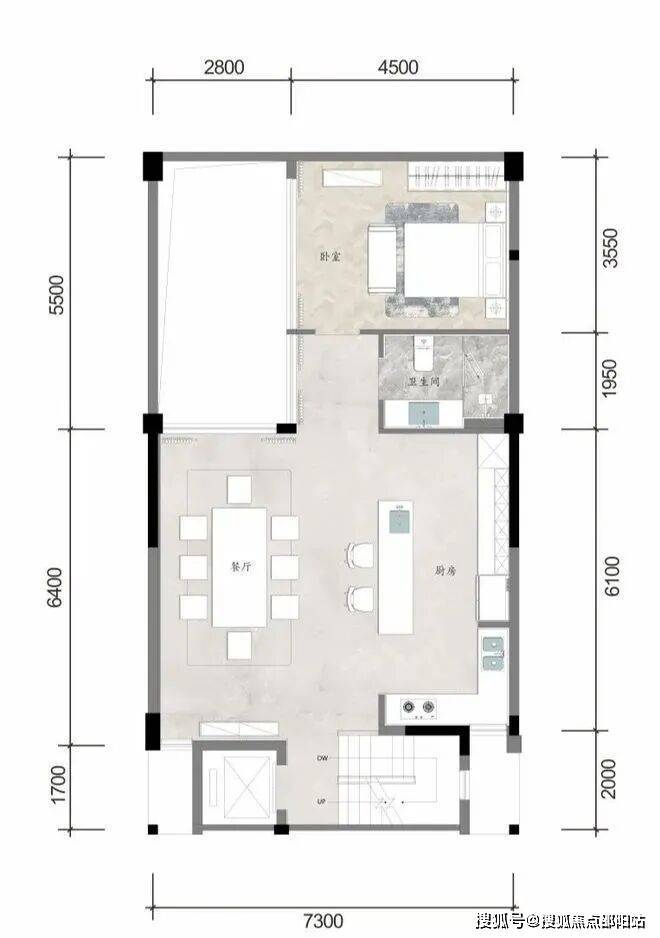 开放式厨房与餐厅连通,尺度宽阔,动线流畅