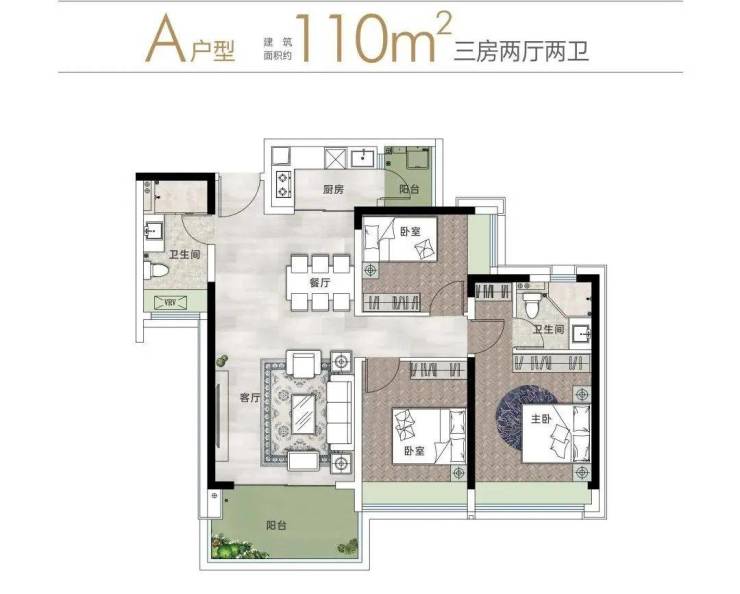 建面约111㎡ 三房两厅两卫户型不仅同样出彩,客厅开间还做到了约4m,搭配餐厅采光大窗,以及宽尺阳台双面采光视野,仿佛被景观包围,整个客餐厅更显尺度非凡!