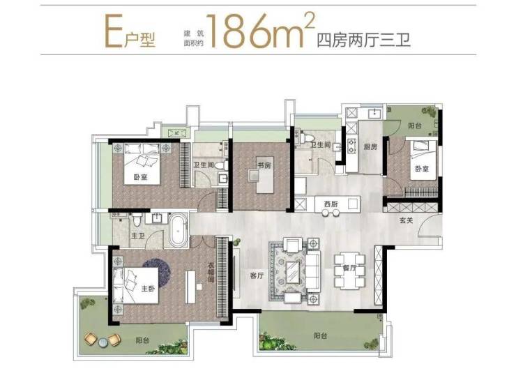 建面约186㎡ 四房两厅三卫户型则为本次推出的顶奢户型,尺度最为奢阔,采用横厅设计,面宽达到约7.5m!