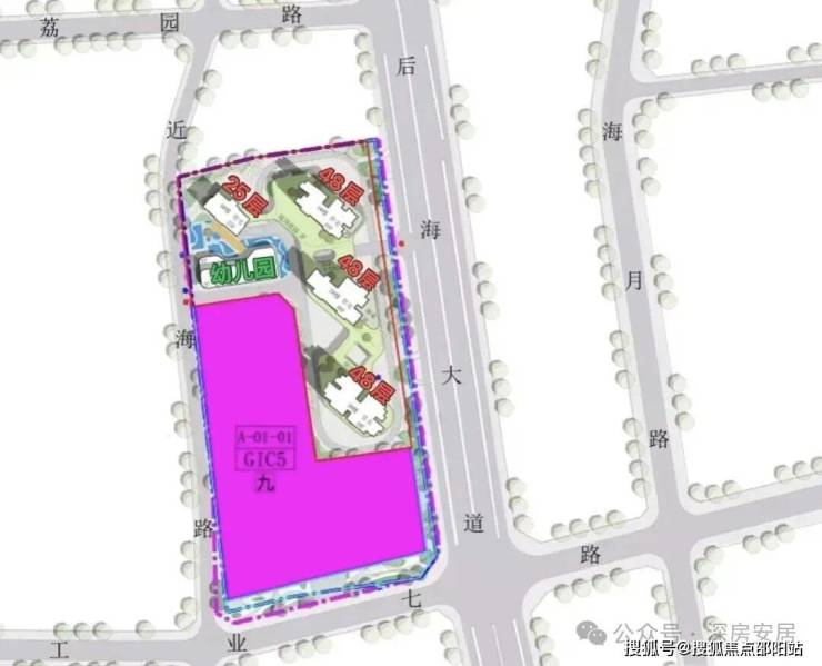 从平面效果图看,规划3栋48层的超高层和1栋25层的高层住宅,另配建一所幼儿园和一所九年一贯制学校。
