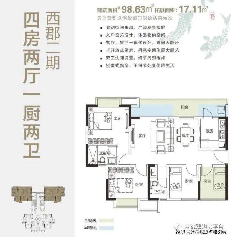 罕见99m2四房,可拓展面积17m2,使用面积116m2,4房+2厅+2卫,突破传统,傲视全城。