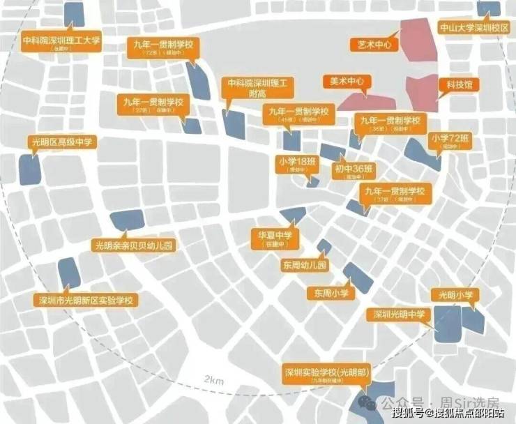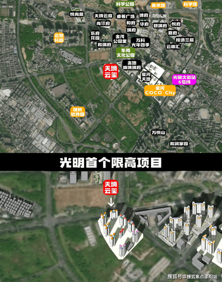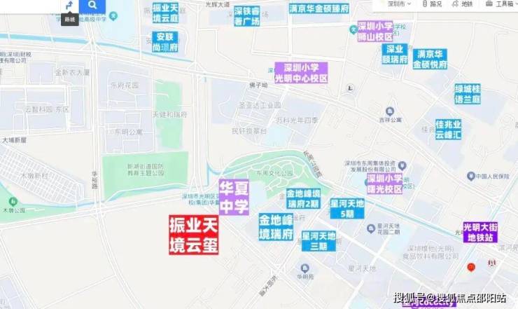 振业天境云庭,位于深圳光明中心区核心腹地,华夏路与周家大道交汇处,紧邻华夏中学,坐拥科学公园绿轴景观。项目所在区域原为工业用地,经规划调整后转型为低密度居住区,容积率仅3.1,远低于周边竞品。北侧为东周文化公园、国防教育主题公园及木墩村公园,东侧紧邻东周小学等优质教育资源,西侧与南侧为待开发空地,保证了开阔的景观视野和低密度居住体验。项目处于光明科学城规划的"产业转化区"与"生活服务中心"交汇处,直接受益于科学城人才导入和区域价值提升。
