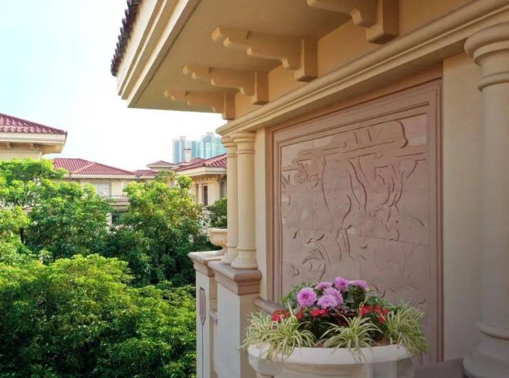 建筑外立面采用新古典欧式建筑风格,运用朱砂暗红和黄色为主色调,欧式别墅用材用料均采用进口高档石材,打造沉稳、大气、高贵的墅质形象与皇家气度。产品主要为独栋别墅和双拼别墅,楼间距在30-50米之间,私密性极强,是湾区罕见的低密度豪宅别墅区。
