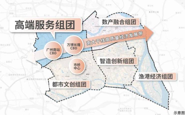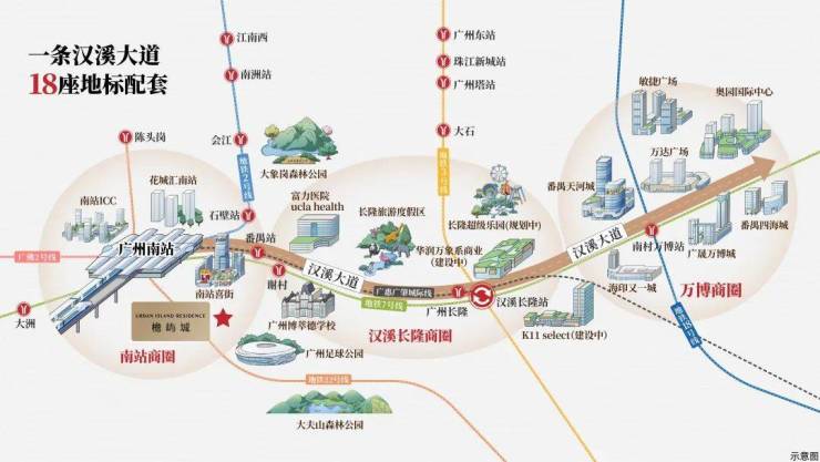 广州南站串联万博、长隆两大板块,以“超级枢纽+超级商圈”模式平移都市中心,南站8km范围聚集番禺70%的经济总量、70%的常住人口,拥有前沿的产业体系+集中的商业配套+宜居的生态资源+高效的通勤速度,是番禺最适合生活居住的组团,打造广州不可复制的“黄金动脉”。