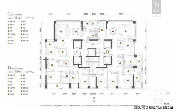 T4栋为314平和330平4房3厅3卫户型