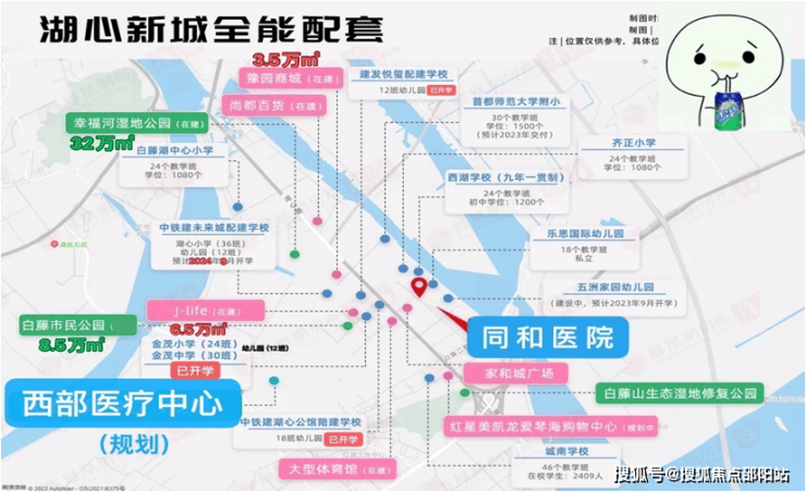 小学:湖心小学36班(已建好,今年已招生一年级4个班,约600米)