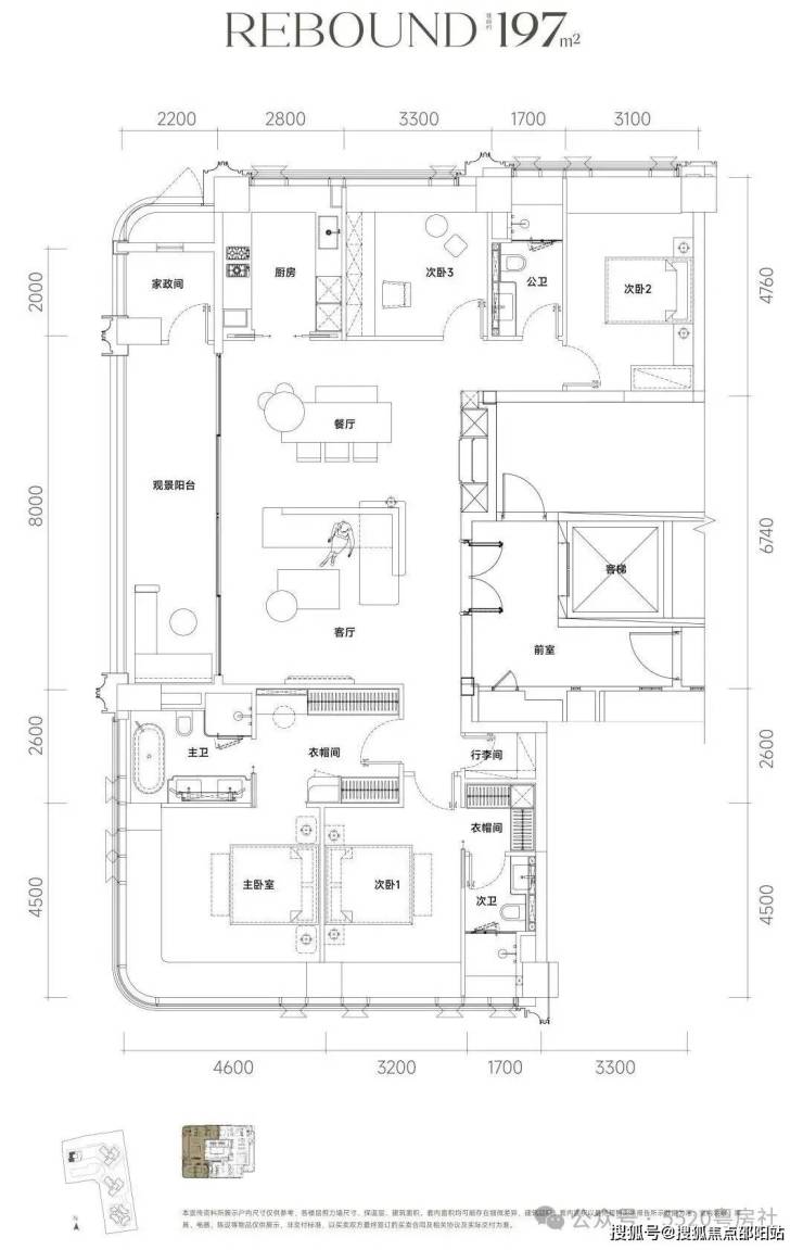 约197㎡ 四房三卫两厅、三面采光、主卧套房、270°转角奢华空间全景落地窗。