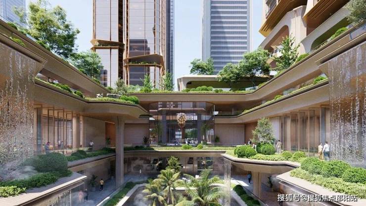 以内部庭院为核心,二层设人行天桥连接休闲区,三层规划户外花园和泳池;配套共享会所、艺术空间、健身中心、儿童乐园及社区花园,形成“垂直社区”生活场景。