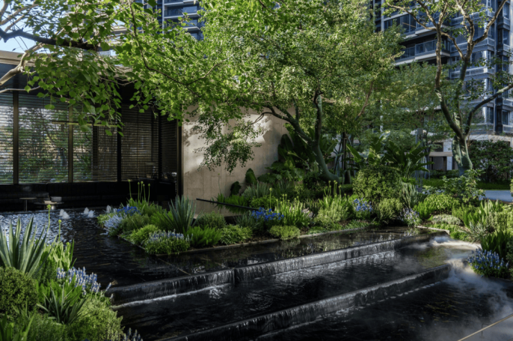 穿行在园区,极具仪式感的树列、精心点缀的花草,涓涓涌动的流水,一步一景、一景一画,每一处细节都得到恰如其分的展现。