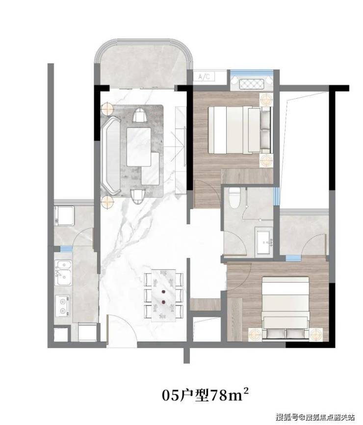 05户型:约78㎡,两房两厅一卫