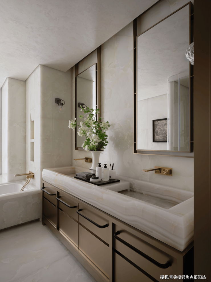 清水玉地面贯穿室内空间,半吨重白玉洗手台整体打磨,使其呈现出淡雅的色泽和岁月的润泽。