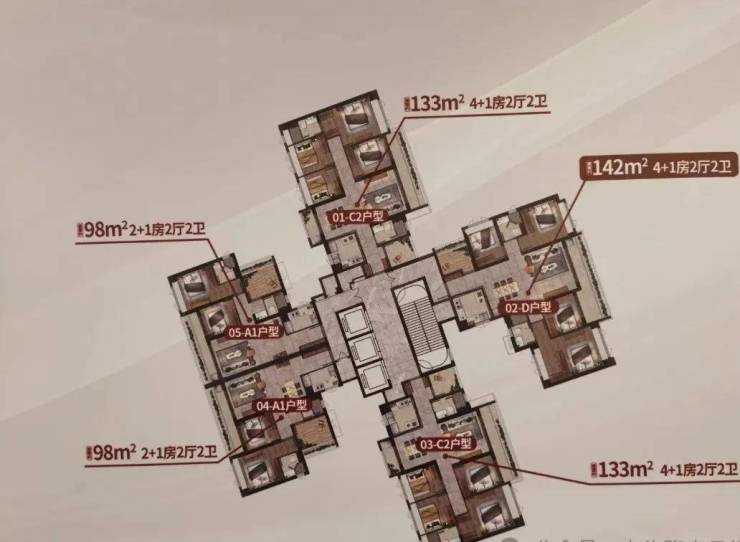 小区规划8栋楼,围合式设计,目前主要在售是6、7栋的133方和142方的大面积为主,小面积卖完了了。