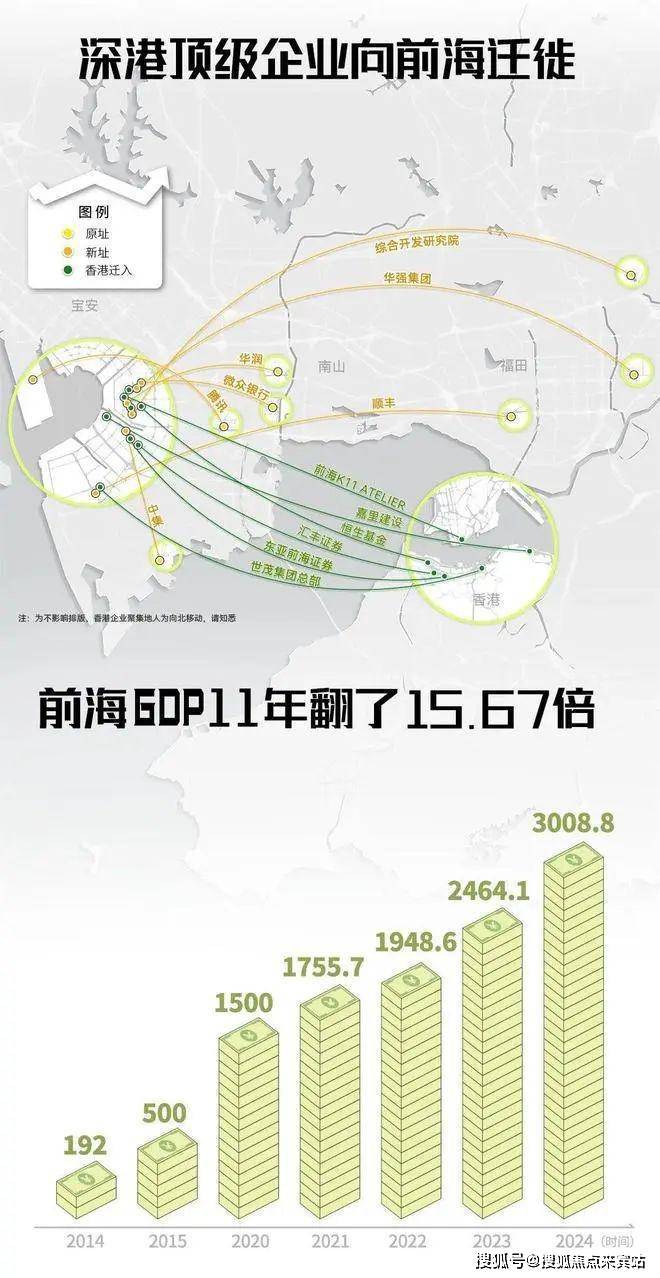 根据戴德梁行统计,前海三湾甲级写字楼净吸纳量连续4年在深圳市排名第一。前海的GDP从2014年到2024年,11年翻了约15.67倍。